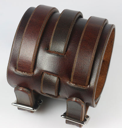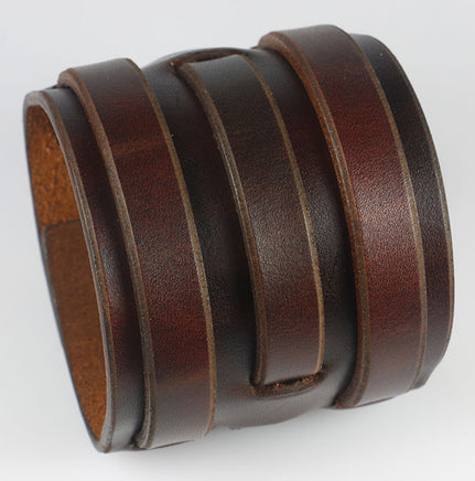 The brown buckling triple weave is an amazing leather cuff. 2 3/8" wide, and a pair of high quality 1/2" polished nickel brass buckles make this leather wristband a long standing favorite. Made from full grain natural leather.