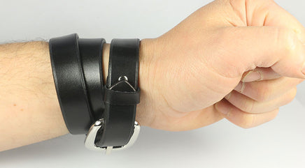 3/4" wide leather strap wraps 3 times around your wrist and clasps with a highly polished coined brass buckle with nickel coating. Choose from black, brown or red leather.